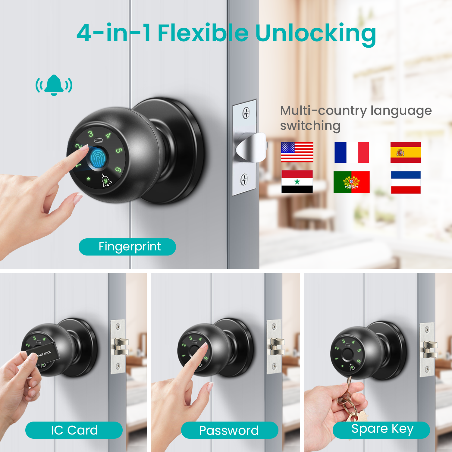 This smart lock supports 4 unlocking methods: fingerprint, password, key, and IC card. Supports voice prompts in 6 national languages.